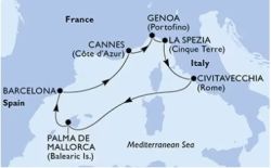 7.nap (október 26.):Városnézés Genova-ban, mely évszázados hajózási múlttal rendelkező tengeri nagyhatalom volt, Olaszország legnagyobb és legfontosabb kikötője a Földközi-tenger kapuja. Gyalogos sétánk során elhaladunk a történelmi kikötő nevezetességei mellett (Aquárium, Kalózhajó, Bioszféra, Bigo, Piac). Az óvárosban megtekintjük a San Lorenzo katedrálist, elsétálunk a Hercegi Palotától Kolombusz házáig. A híres Garibaldi utcán megtekintjük a legszebb palotákat, melyek napjainkban bankoknak és múzeumoknak adnak otthont. Ezek a 16. századbeli paloták az Unesco Világörökség részét képezik. Szabadidő után visszaszállás a hajóra.
